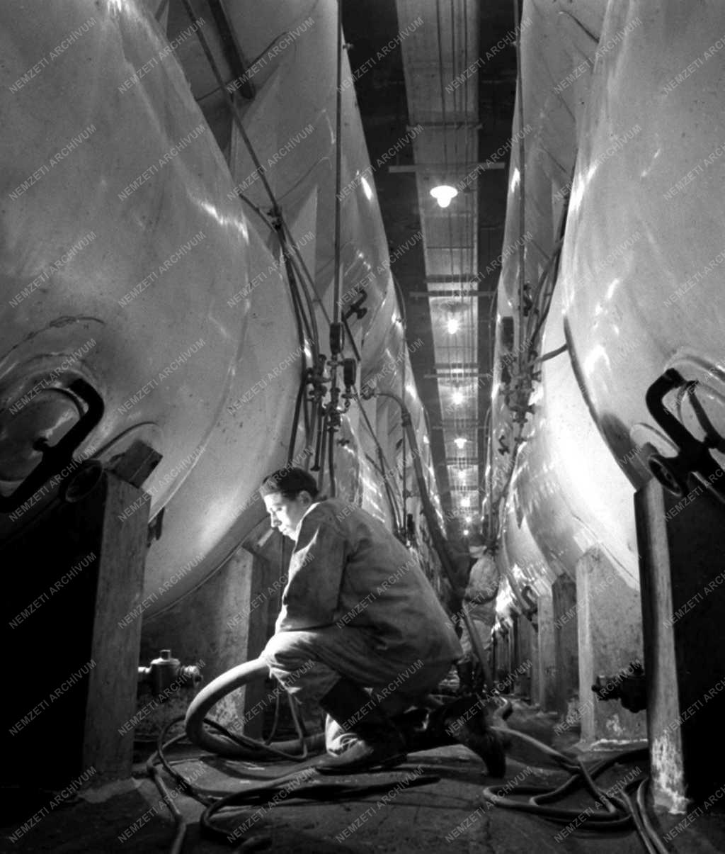 Munkások dolgoznak az alumíniumtartályok között. Az ászok pincékben ma már nem fahordókban, hanem 10 ezer hektoliteres alumínium tartályokban érlelődik a mintegy 120 ezer hektoliter sör a Magyar Országos Söripari Vállalatnál, ahol az idén 250 000 hektoliterrel gyártanak többet, mint 1962-ben. Hazánkban - a vállalat statisztikája szerint - egy lakos évente átlag 41 liter sört fogyaszt.