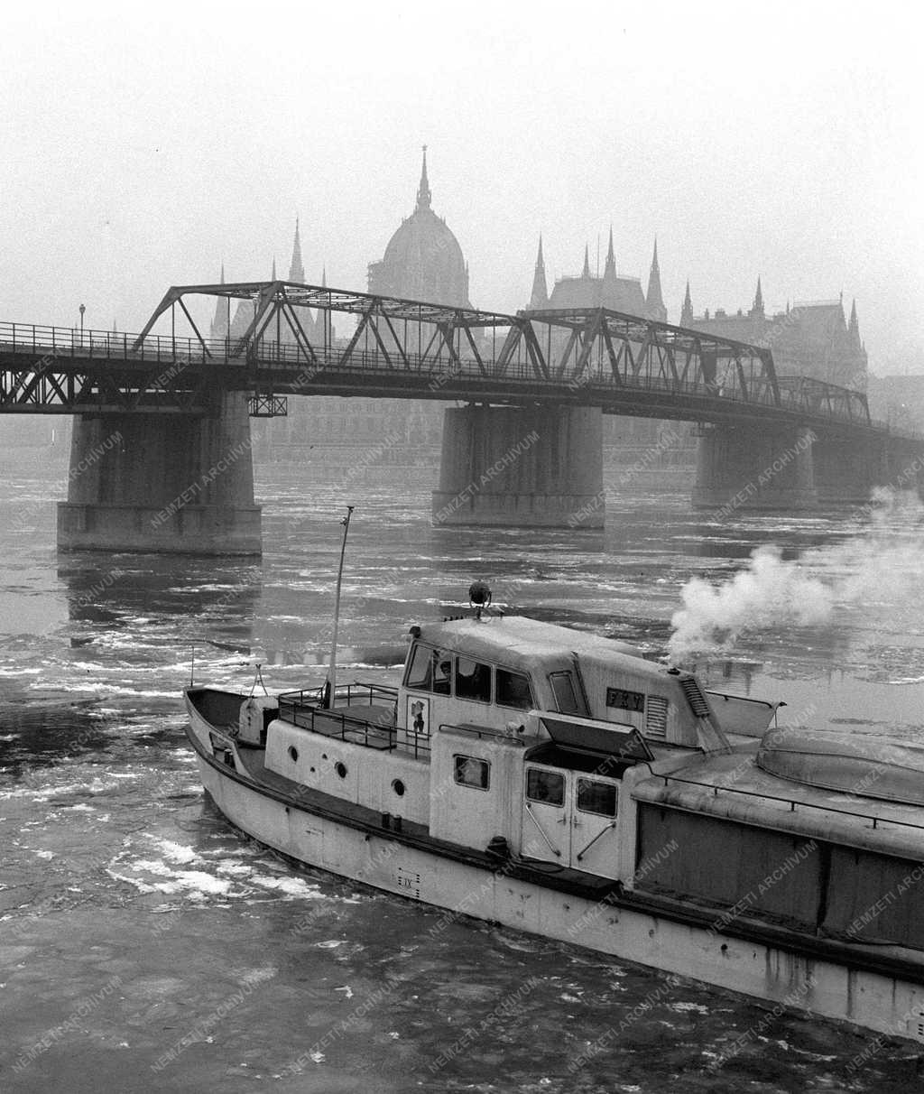 A fagyos időjárás tartóssá vált. Zajlik a Duna. A Kossuth híd alatt haladó átkelőhajónak ezzel is számolnia kell.