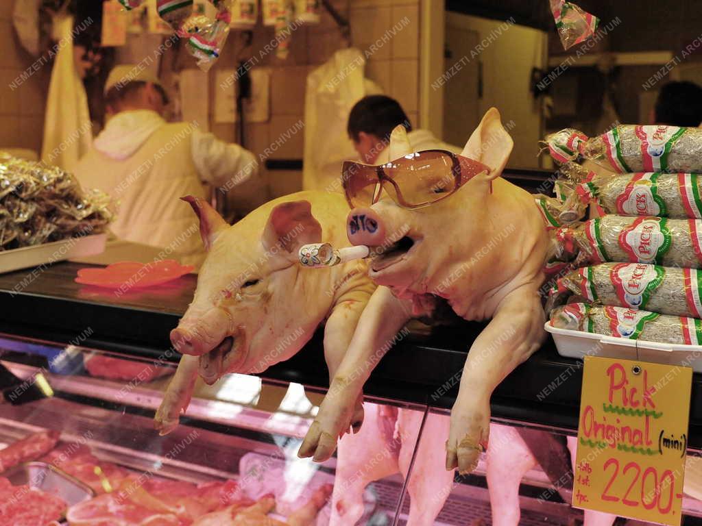 Sütésre váró újévi malacok a Vámház körúti nagycsarnokban.