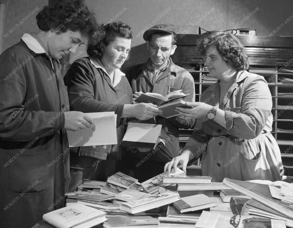 Mikházi Ilona könyvbizományos (j) az újonnan érkezett könyveket mutatja a Mezőgazdasági Gépgyár dolgozóinak. A könyvforgalmat a város és a járás területén 60 társadalmi aktívista és könyvbizományos segíti.