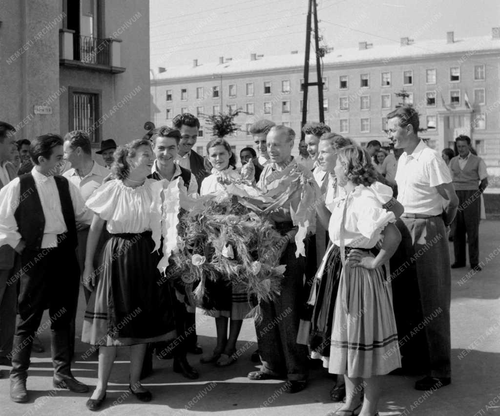 A dolgozó parasztok küldöttsége régi népszokást felelevenítve búzakoszorút ad át a pártbizottság képviselőinek az új kenyér ünnepén és egyben munkás-paraszt találkozón Sztálinvárosban, az Alkotmány hetedik születésnapján.