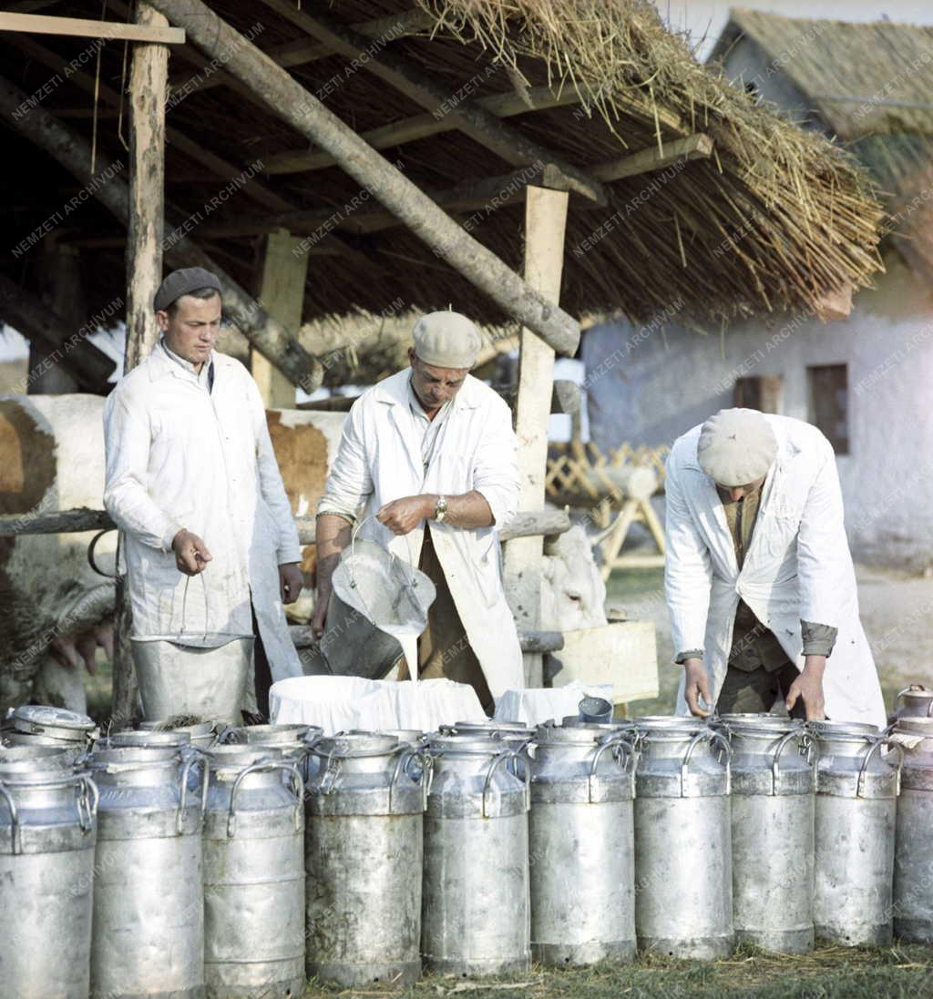 Átszűrve töltik kannákba a lefejt tejet egy termelőszövetkezet tehenészetében. A felvétel készítésének pontos helye ismeretlen.