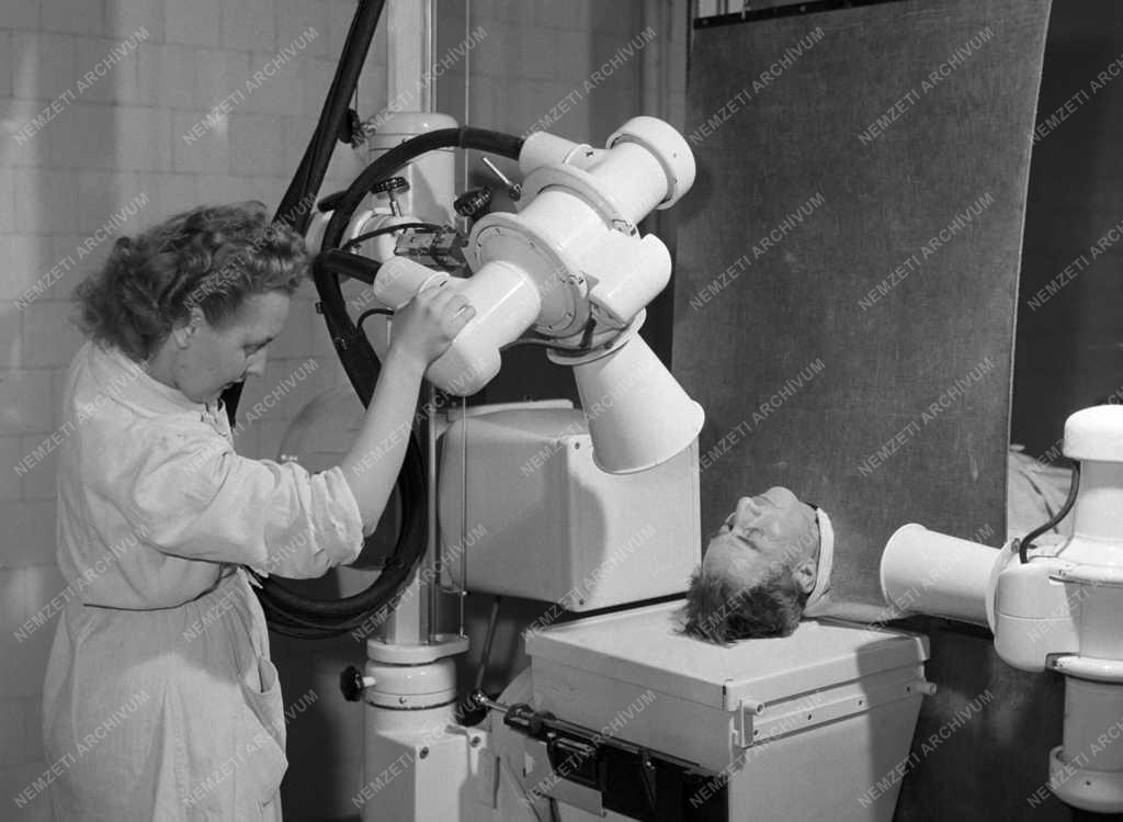 Szenes Zsuzsa asszisztensnő beállítja egy beteg vizsgálatához az új röntgendiagnosztikai készüléket az Országos Idegsebészeti Tudományos Intézet röntgen-osztályán.