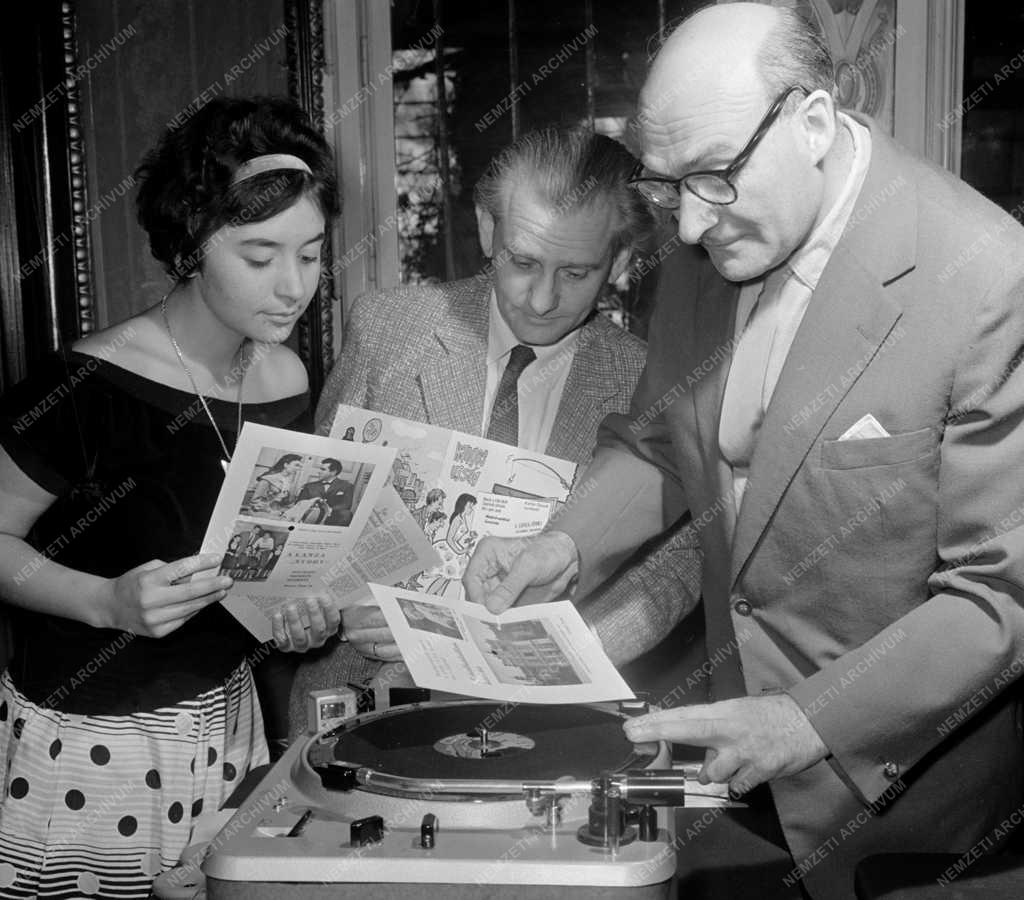 Ritter Aladár, a Hangos Újság egyik feltalálója (j) Selymes Judit és Lakatos István társaságában lemezjátszóra tesz egy újságoldalt a Magyar Sajtó Házában rendezett bemutatón. A műanyaggal bevont újságlapra nyomott hanglemez kiegészítője az újságban lévő szövegnek.