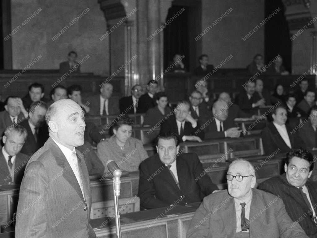 Barcs Sándor képviselő, államtitkár, a Magyar Távirati Iroda vezérigazgatója felszólal az Országgyűlés decemberi ülésszakának második napján. Jobbra Erdei Ferenc, a Magyar Tudományos Akadémia főtitkára, az Agrártudományi Kutató Intézet igazgatója.
