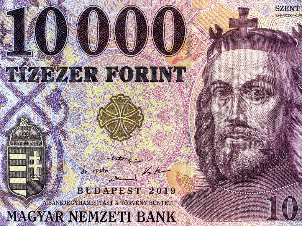 Szent István király arcmása a 10000 forintos címleten. A 2019. év végén a Magyar Nemzeti Bank befejezi a bankjegyek korszerűsítését. A biztonsági elemek,- hologram fólia, színváltó nyomat, biztonsági szál, metszetmély nyomtatás, illeszkedő jel, vízjel, vakjel mellett megtartva a több évtizedes grafikai tradiciókat.