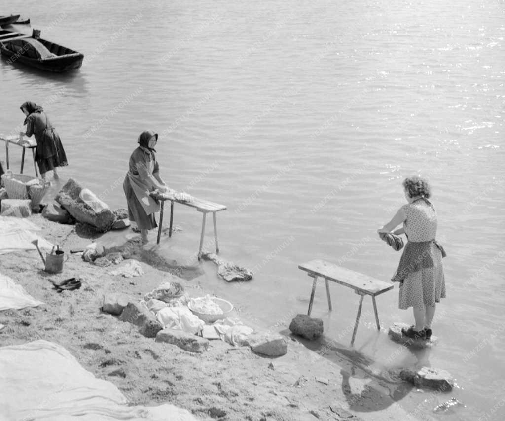 Asszonyok kézzel mossák a mosószékeken a ruháikat a Duna-parton.