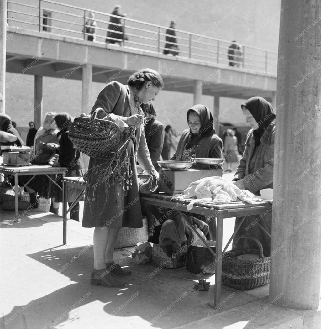 Az egyéni dolgozó parasztok termékeiből sokan vásárolnak az április 21-én nyílt Fény utcai vásárcsarnokban Budán.