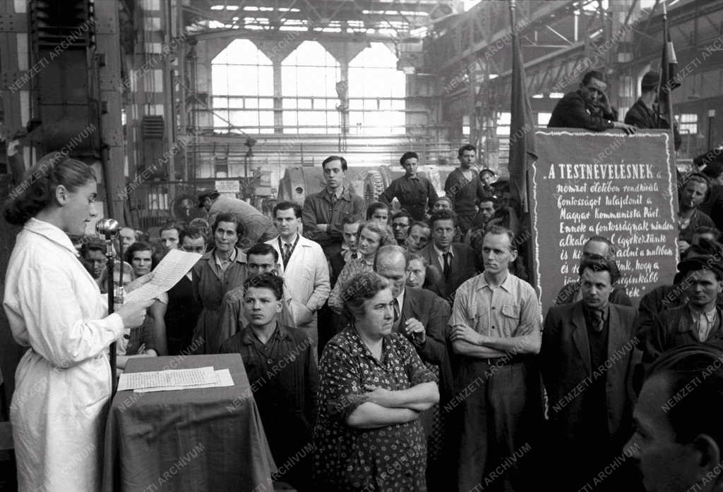 Molnár József villanyszerelő, a Ganz Villamossági Gyár dolgozója (j3) munkatársaival együtt Korondi Margit olimpiai bajnok tornász (b) beszámolóját hallgatja a munkahelyén.