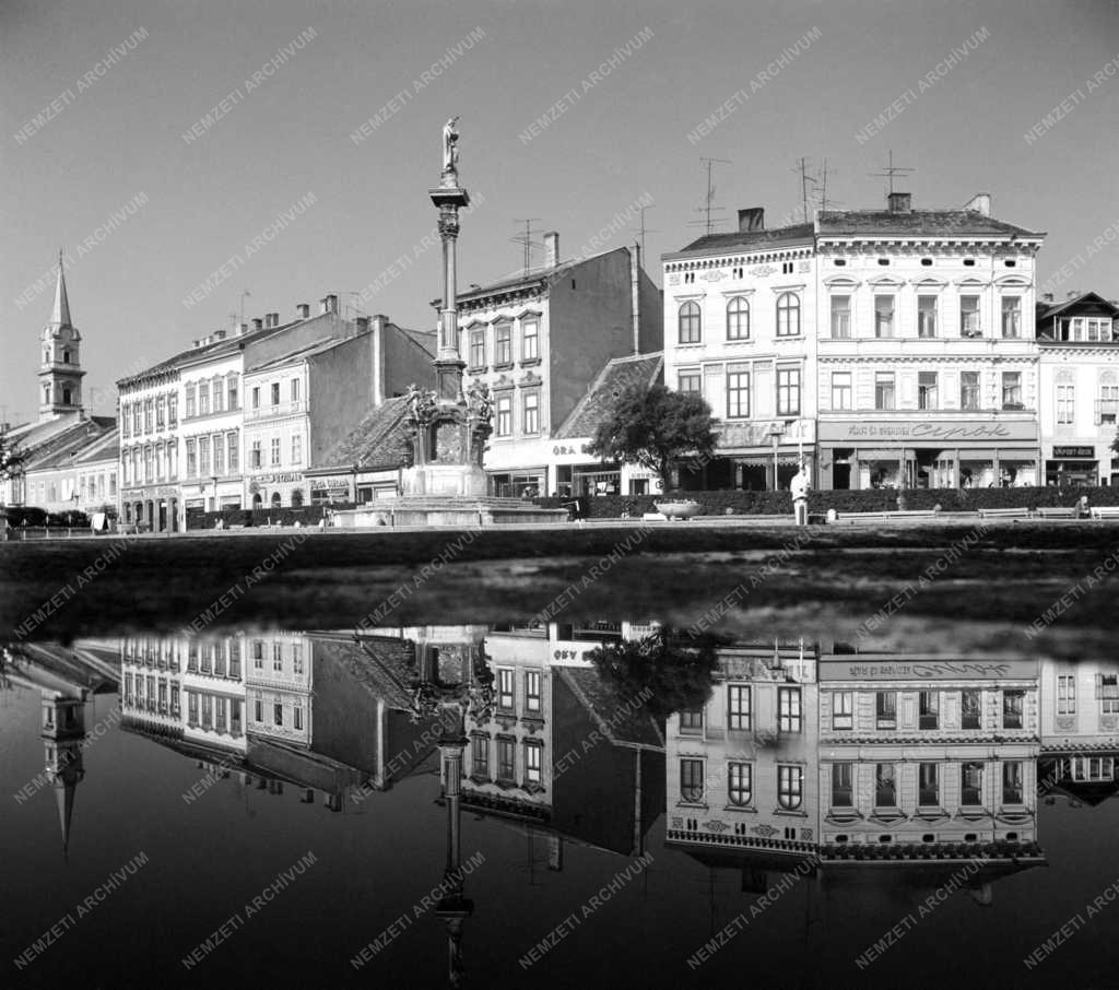 A háttérben az Immaculata-szobor. Az emlékművet Andreas Altomonte tervei alapján Jakob Schletterer bécsi szobrász, valamint Hauch Tóbiás és Eisenkölbl Lőrinc soproni kőfaragók készítették 1745-ben.