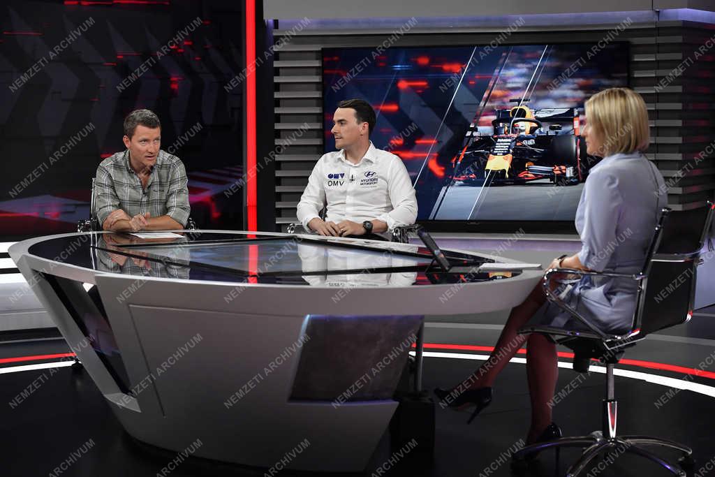 Wéber Gábor autóversenyző, televíziós szakkommentátor, újságíró (b) és Michelisz Norbert SEAT León Európa-kupa és többszörös túraautó-világbajnoki futamgyőztes magyar autóversenyző, az M4 Sport televíziós csatorna szakkommentátorai Petrovics-Mérei Andrea szerkesztő-műsorvezető társaságában a Forma-1 Osztrák Nagydíj közvetítésekor, az MTVA Kunigunda utcai gyártóbázisának stúdiójában.