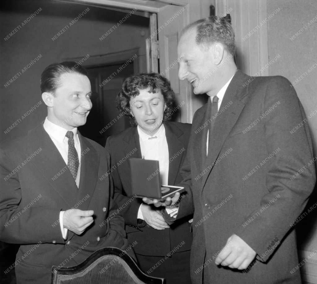 Kovács Dénes hegedűművész, a Liszt Ferenc-díj első, Balogh Éva, a Liszt Ferenc-díj III. és Kórodi András karmester, a Liszt Ferenc-díj I. fokozatával kitüntetett művészek (b-j) a Művészeti Szövetségek Házában a kitüntetések átadása után adott fogadáson.