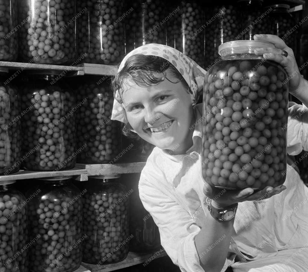 Az Édesipari Gyümölcstermelő Célgazdaság ecsédi üzemegységének dolgozója a raktárban mutatja az üvegben tárolt válogatott meggyet. Az üzemben 10 vagon azonos méretű meggyből készítik elő a konyakos meggy elnevezésű édesség alapanyagát a csokoládégyárak részére.
