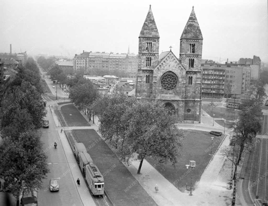 Az Árpád-házi Szent Margit-templom a XIII. kerületi Élmunkás téren. Mellette a Váci úton villamos halad el.