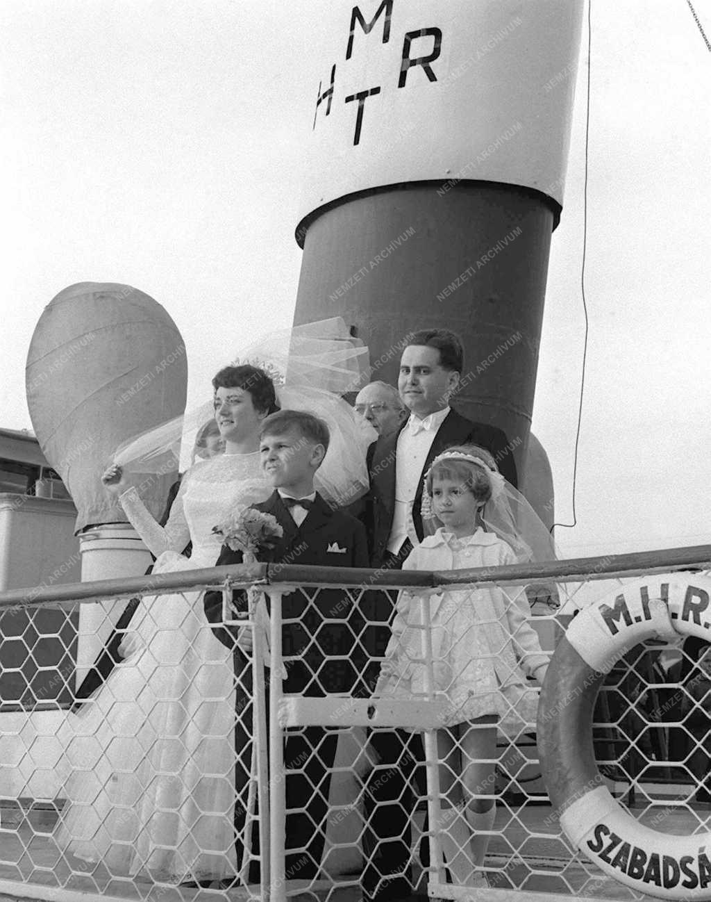 Szilágyi János sebészorvos és Tenzlinger Ildikó, az IBUSZ tisztviselőnője esküvőjük után fényképezkednek a Szabadság sétahajó fedélzetén, ahol az esküvői vacsorát rendezik. A hajó kapitánya az egyik örömapa.