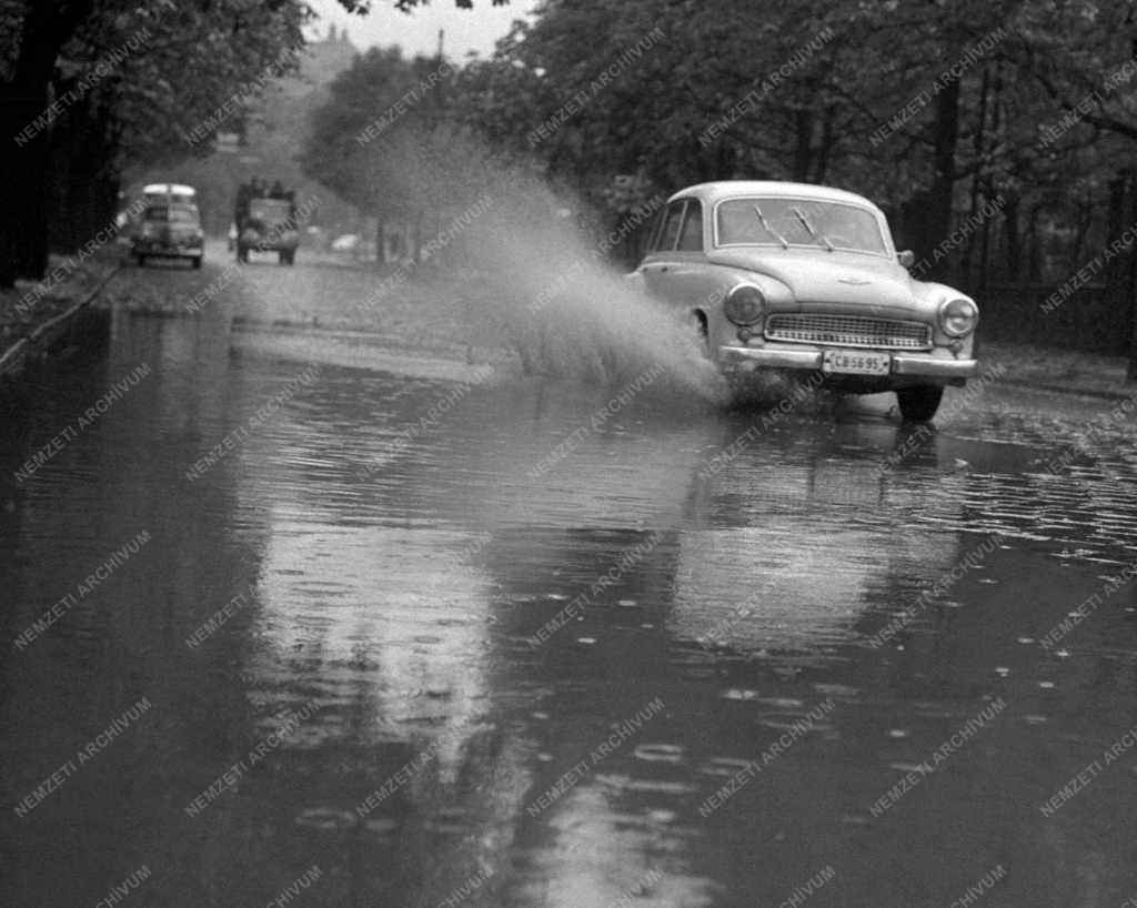 Személyautó közlekedik egy elöntött utcán. A Budapestre lezúduló nagy mennyiségű eső több utcában megrekedt, ezzel nehezítve a közlekedést.