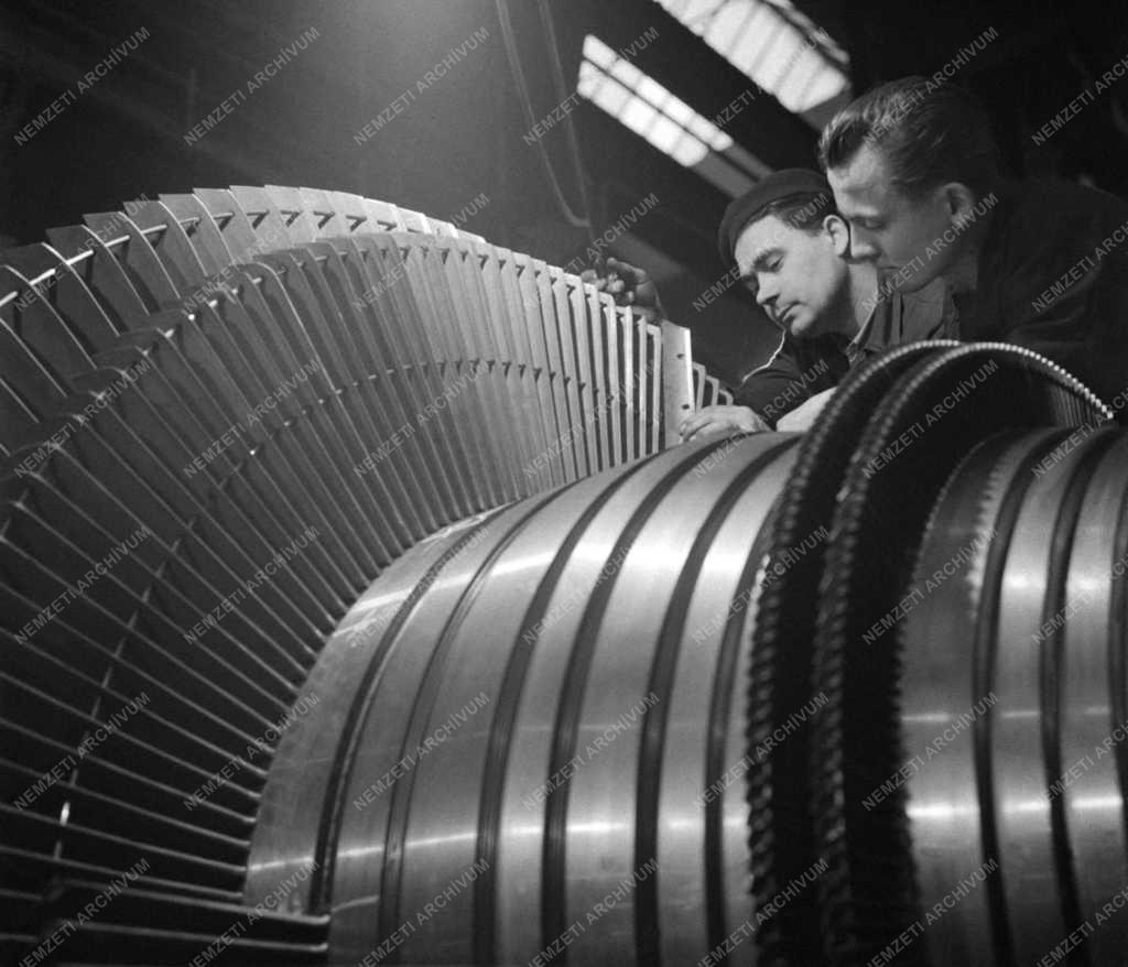 Gyuricza Pál szerelő és Schrankó Lajos géplakatos tanuló a Kínai Népköztársaság részére készülő 32 megawattos turbina forgórészét lapátozzák.