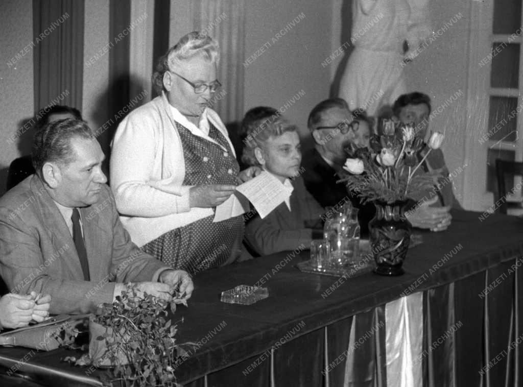 Ratkó Anna, az Országos Béketanács alelnöke, a SZOT (Szakszervezetek Országos Tanácsa) titkára és az MNDSZ (Magyar Nők Demokratikus Szövetsége) Intézőbizottságának tagja nyitóbeszédet mond az MNDSZ kibővített országos elnökségi ülésésén, ahol a Hazafias Népfronttal való egyesülésről tárgyaltak. Ratkó Anna mellett balra Vass Istvánné, az MNDSZ elnöke, valamint Szabó Pál, a Hazafias Népfront Országos Tanácsának elnöke ül.