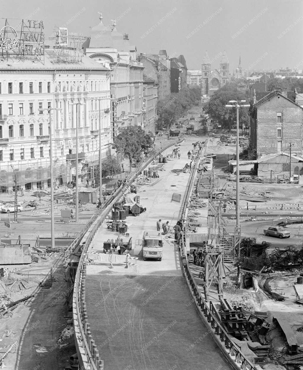 Épül a Marx (1990-től Nyugati) téri felüljáró, a Hídépítő Vállalat munkásai a korlátokat állítják be, a külső köpenyfalat rakják föl és szigetelik a hidat. Háttérben a Lehel téri Árpád-házi Szent Margit-plébánia temploma.