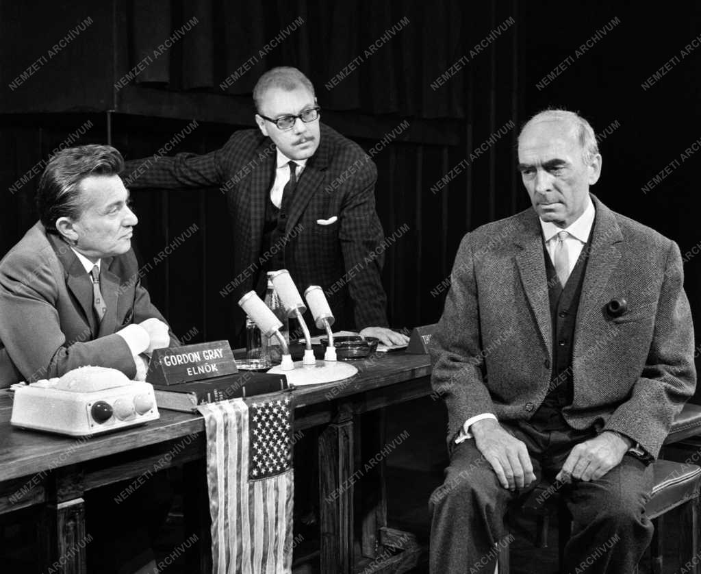 Egri István Gordon Gray, Horkai János Thomas A. Morgan és Major Tamás Julius Robert Oppenheimer szerepében (b-j) Hainer Kipphardt Az Oppenheimer ügy című drámájának egy jelenetében. A darabot 1965. április 23-án mutatták be Fábri Zoltán rendezésében a Nemzeti Színházban. A megváltozott szereposztás, illetve szerepkettőzés miatt Both Béla és Egri István álltak új szereplőként színpadra.