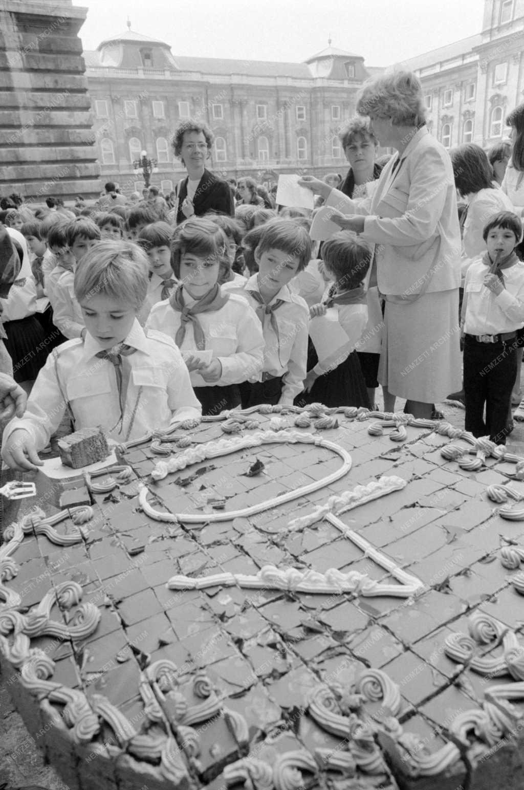 Óriás, születésnapi tortából vesznek el szeleteket az újonnan felavatott gyerekek a Magyar Úttörők Szövetségének 40. évfordulója alkalmából tartott avatási ünnepségen. A Várban, az Oroszlános téren, 1200 kisdobost és úttörőt avattak.