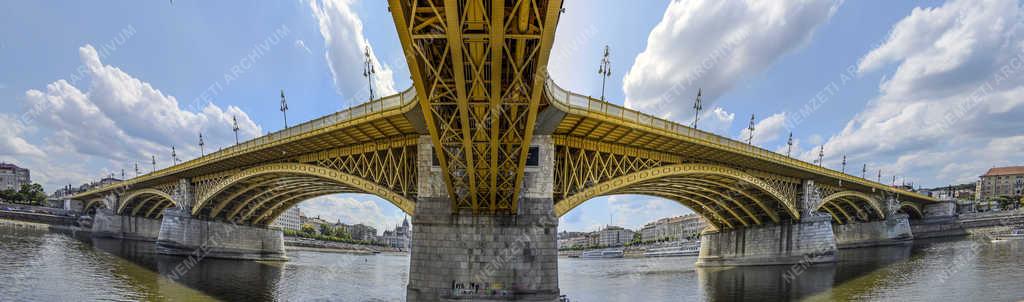A Margit híd szigeti lejárója alól készült panorámakép a hídról, balra Pest, jobbra Buda.