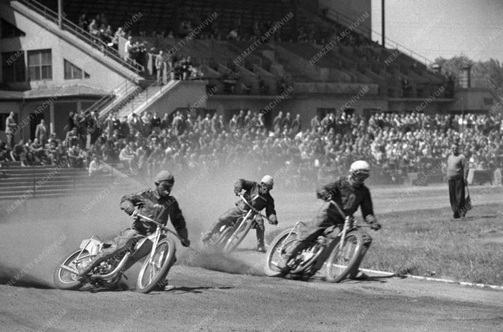 Karsai /8-as, Nyíregyháza/ és Bató /12-es, Postás SE/ versenyeznek az 500 kcm-esek futamában az Előre SC rendezésében tartott Országos Motoros Salakpálya Bajnokságon, a Vasas SC sporttelepén /Népliget/.