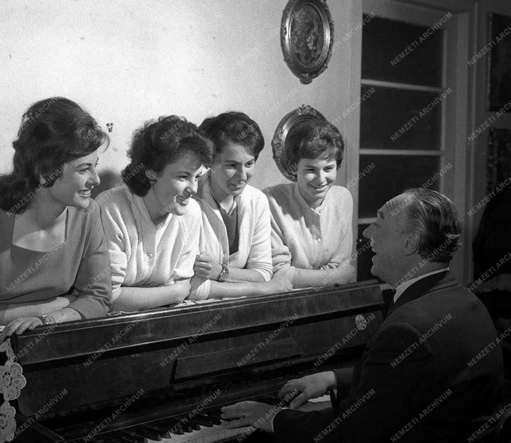 A 40 éves színészi jubilelumát ünneplő Bilicsi Tivadar, a Vígszínház művésze, otthonában lányainak, Erzsinek, Katinak, Marinak és Évának énekel.