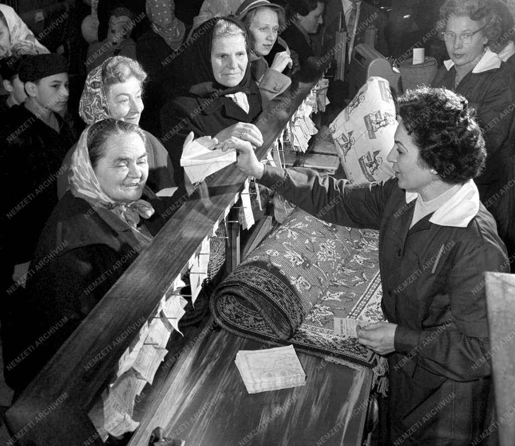 Az eladónő szalvétát ad át idős asszonyoknak az új Szivárvány Áruház csomagolójánál Budapesten, a Nagy Lajos Király úti lakótelepen.