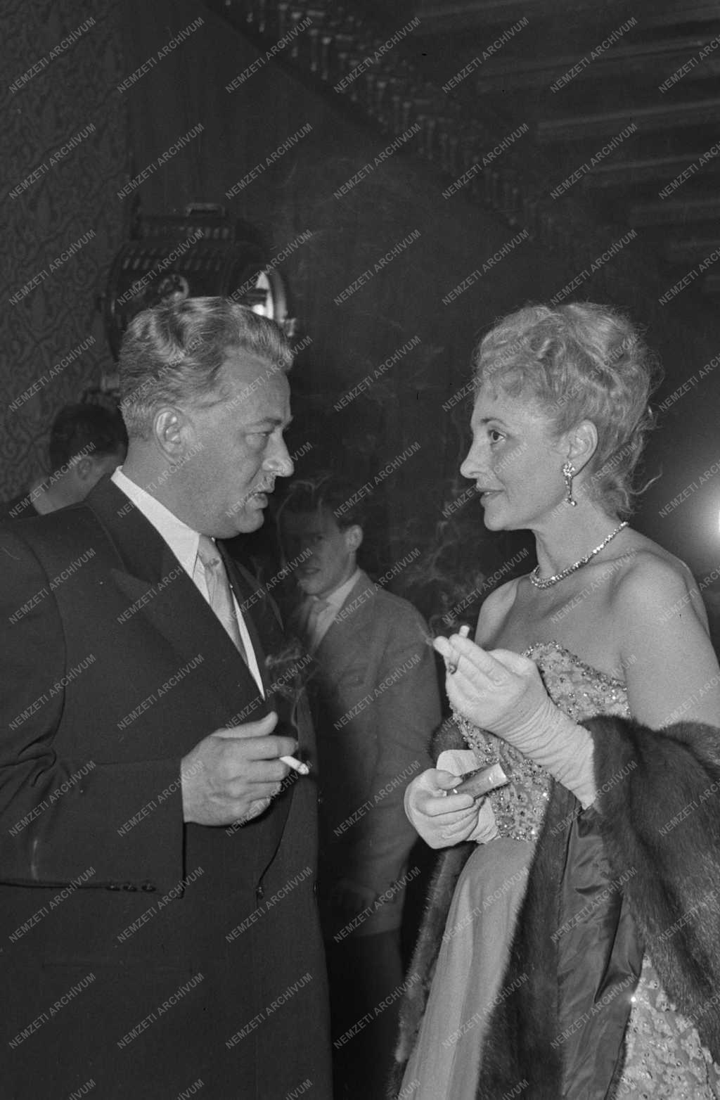 Darvas József népművelési miniszter (b) Jean Aurenche forgatókönyvíró feleségével (k) beszélget a francia filmhét megnyitóján, a Vörös és fekete című film díszelőadásán az Uránia Filmszínházban.