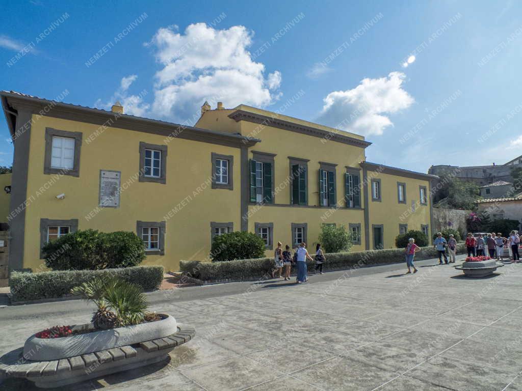 Turisták sétálnak a Palazzina dei Mulini (Mulini palota) előtt. A palota volt Napoleon hivatalos rezidenciája, amikor bukása után 1814-ben száműzték Elbára. Ma az épületben működik a Napóleon által adományozott könyvtár, valamint a múzeum.