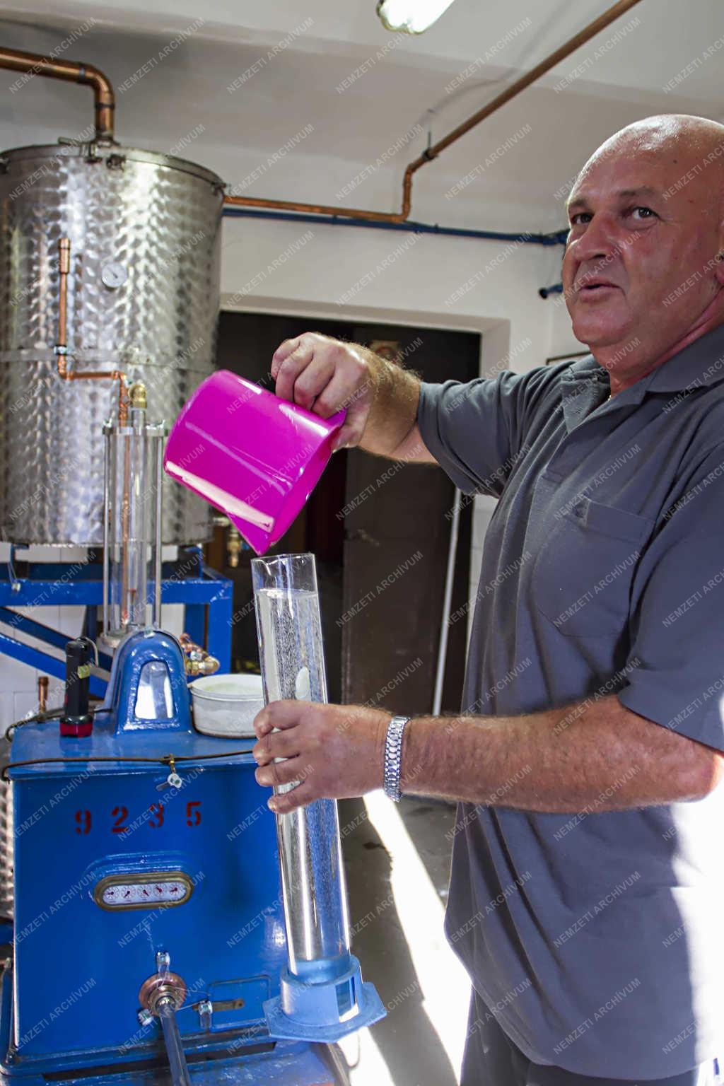 Szabó Gábor üzemvezető mintát vesz a kész pálinka alkoholfokának ellenőrzéséhez az őrségi Viszák pálinkafőzdéjében. A teljesen felújított, modern kétszeres lepárlóval működő, önkormányzati tulajdonban lévő pálinkafőzdében bérfőzés keretében a környékbeli gazdák gyümölcseiből évente több mint harmincezer liter pálinkát állítanak elő.