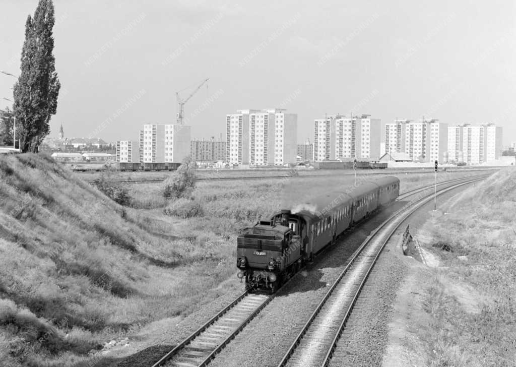 Gőzmozdony húz egy személyvonatot Székesfehérvárnál. A háttérben, a Münnich Ferenc-lakótelep közelében.