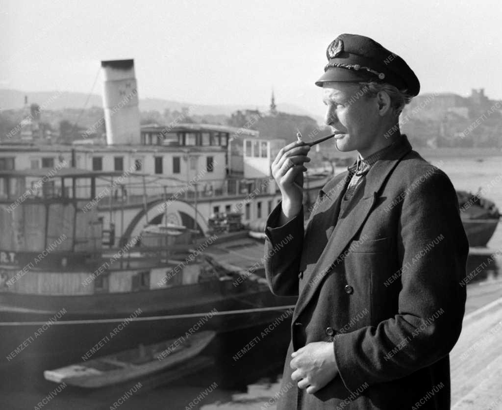 Gusztev Béla a „Kelet” gőzhajó matróza pipázik a Duna-parton.