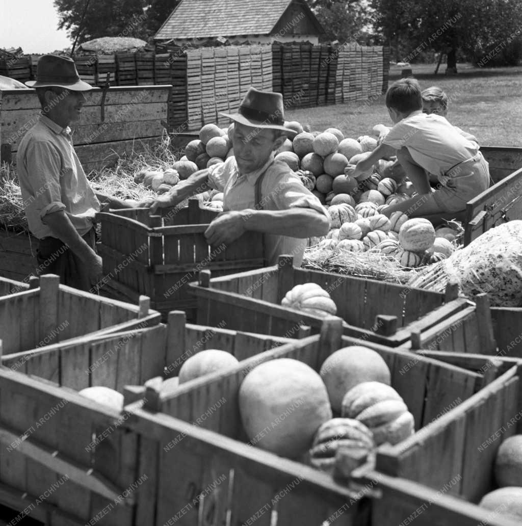 Az Új Élet Termelőszövetkezet dolgozói a betakarított dinnyéket nézik.