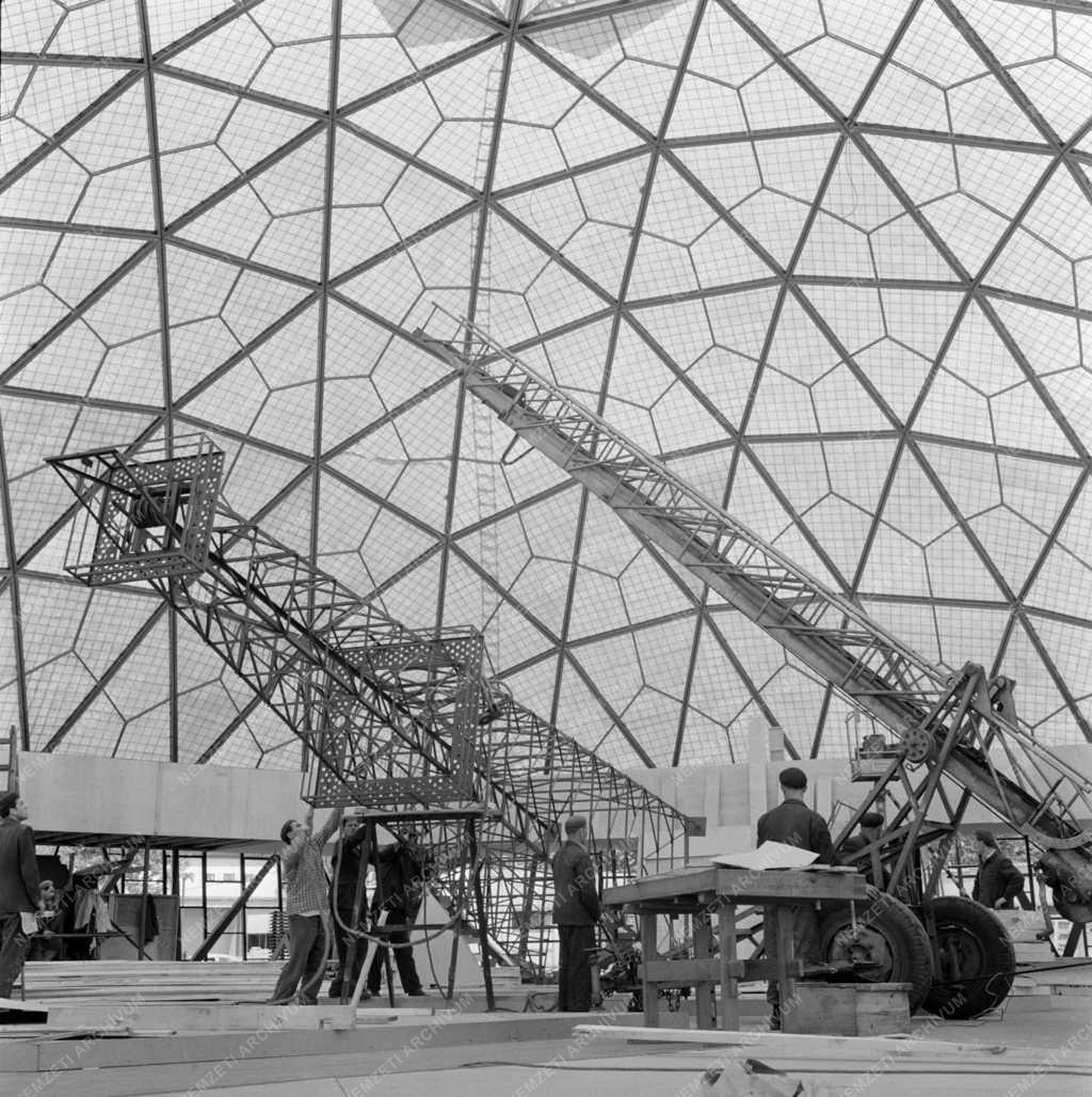 Felállítják a BU-40-es olajfúrótorony makettjét a május 19-én nyíló Budapesti Ipari Vásár nehézipari pavilonjában.
