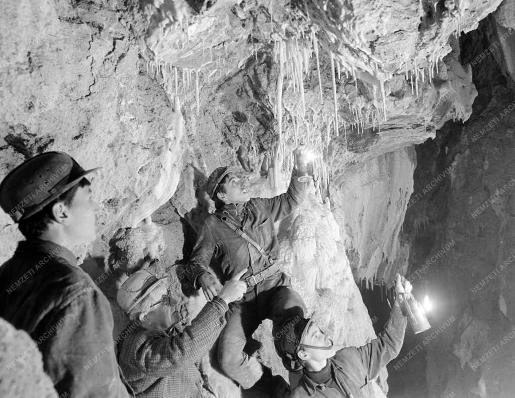Istók Bertalan tanár (b2), Dudás István, Surányi Zoltán és Hunorfi István, az egri Dobó István Gimnázium barlangkutató szakosztályának tagjai a Felsőtárkány határában feltárt, cseppkőképződményekben gazdag barlang kistermében gyönyörködnek a természeti képződményekben.