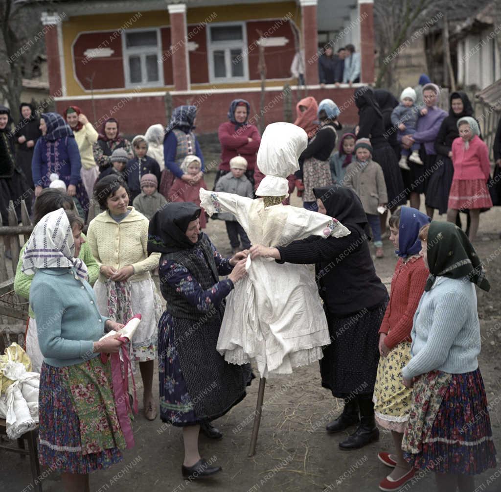 Hegedűs Jánosné és Koplányi Istvánné társaikkal öltöztetik a kiszebábut egy parasztház udvarán, a Nógrád megyei településen, ahol még ma is él a többszázéves nép hagyomány, a kiszehajtás. Egykoron a népviseletbe öltöztetett szalmabábut a község határában azért égették el, hogy a betegséget kiűzzék a faluból. Ma már nem a babonát látják a nógrádi palócok ebben a szokásban, hanem a népviseletes színes felvonulással a tavaszt szeretnék előcsalogatni a dimbes-dombos vidékükre.