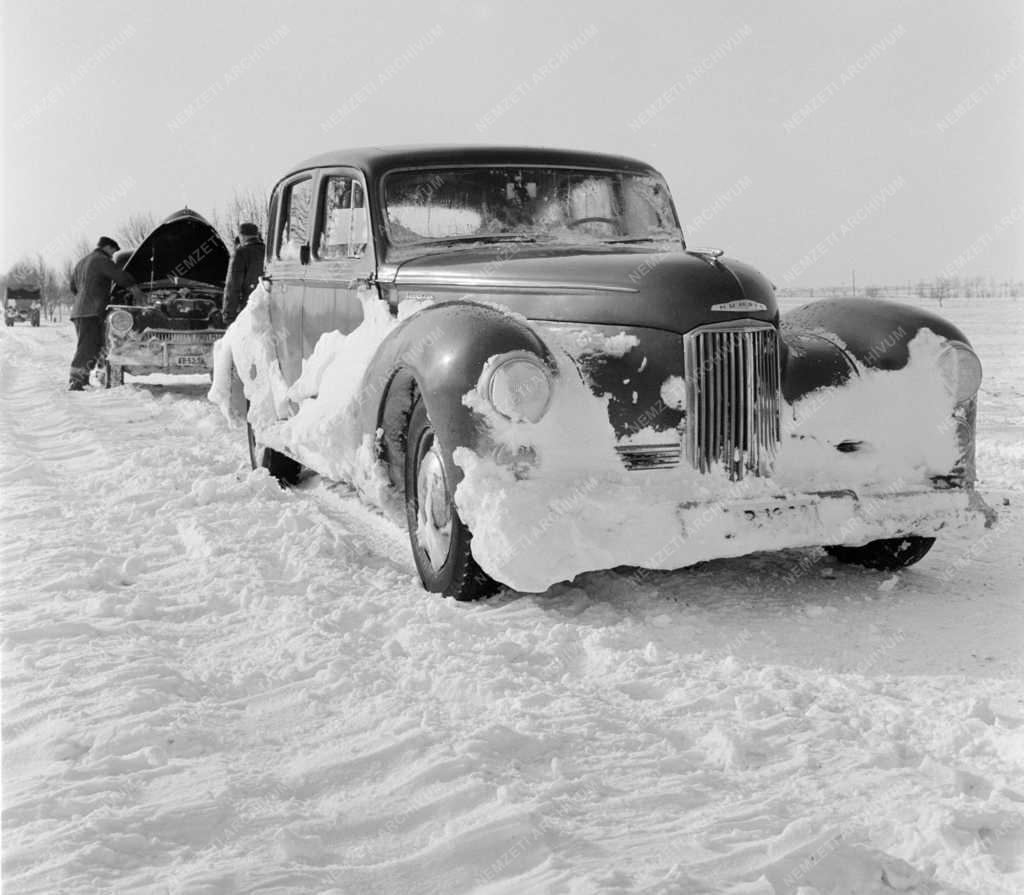 A hófúvásban elakadt járművek közül kimentett Humber Super Sniper típusú autó a Balaton felé vezető út szélén áll, Tárnok és Martonvásár között, a mögötte látható Warszawa M201 autó motorját vizsgálják a sofőrök.