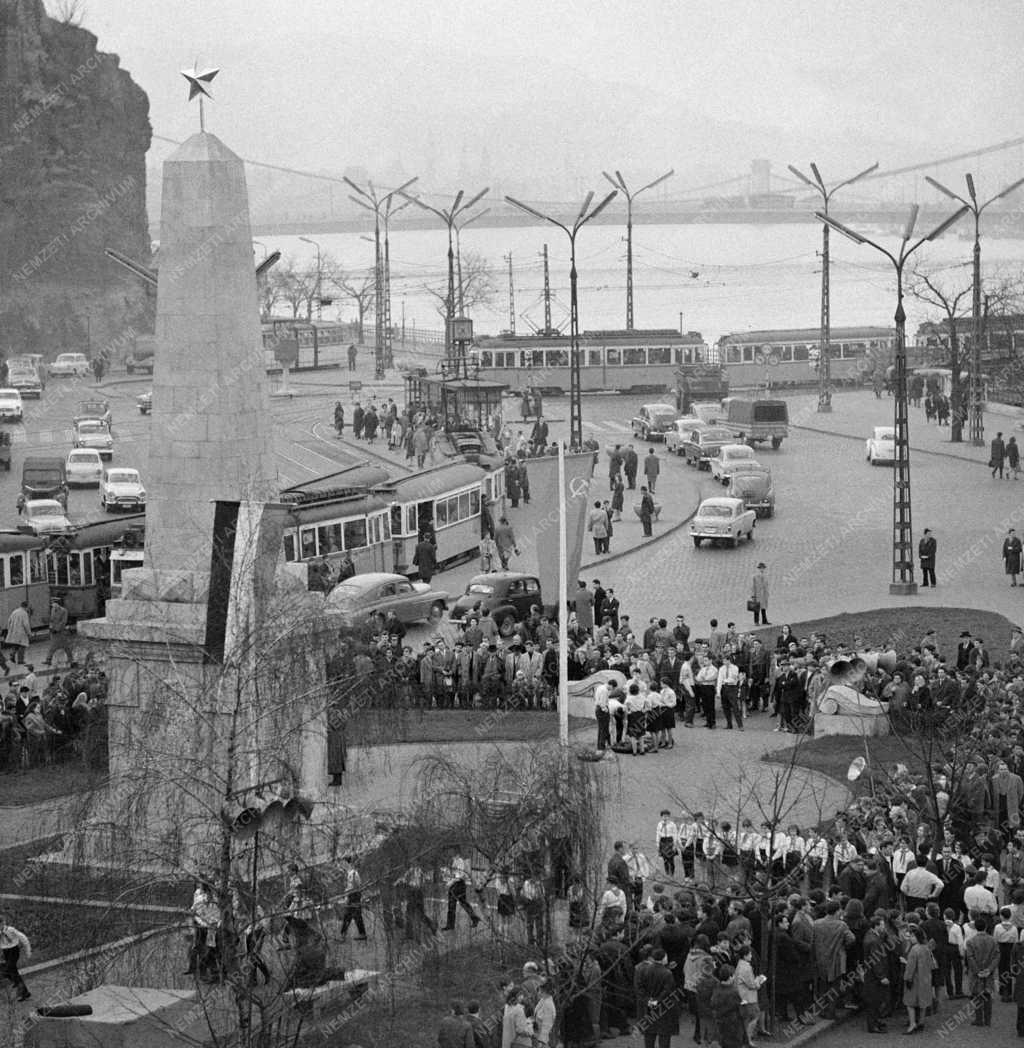 Úttörők és a Kommunista Ifjúsági Szövetség (KISZ) tagjai a hazánk felszabadulásának tiszteletére indított Hálastaféta motorkerékpáros csapatát várják a Gellért téri szovjet hősi emlékműnél, ahol ünnepség keretében további szalagokat kötnek fel a stafétabotokra, valamint Pozsonyi Vilmos, a KISZ Budapesti Bizottságának titkára mond beszédet.