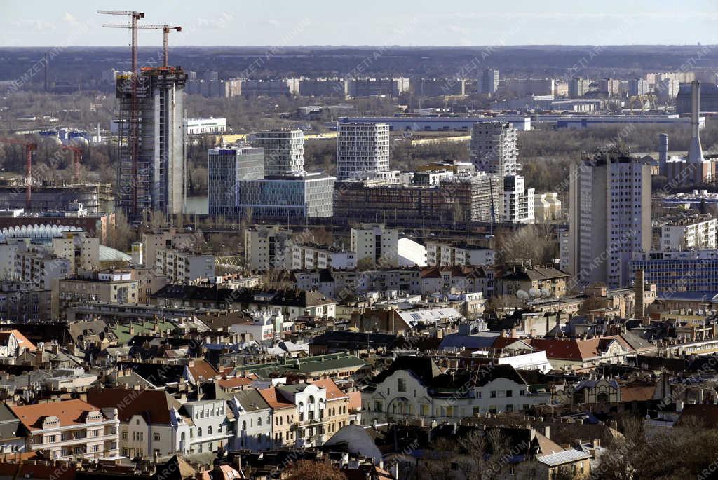 A főváros XI. kerületének részletében balra fent a MOL Csoport MOL Campus néven épülő új székházának toronyépülete a BudaGate városrész nemrég emelt modern lakóépületei mellett.
