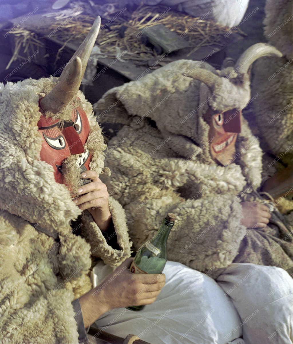 Bundájával kifordított birkabőrbe öltözött sokácok - római katolikus délszlávok - a fűzfából faragott, hagyományosan állatvérrel festett, birkabőrcsuklyás maszkban, a tavaszváró, téltemető népszokás a busójárás alkalmával.