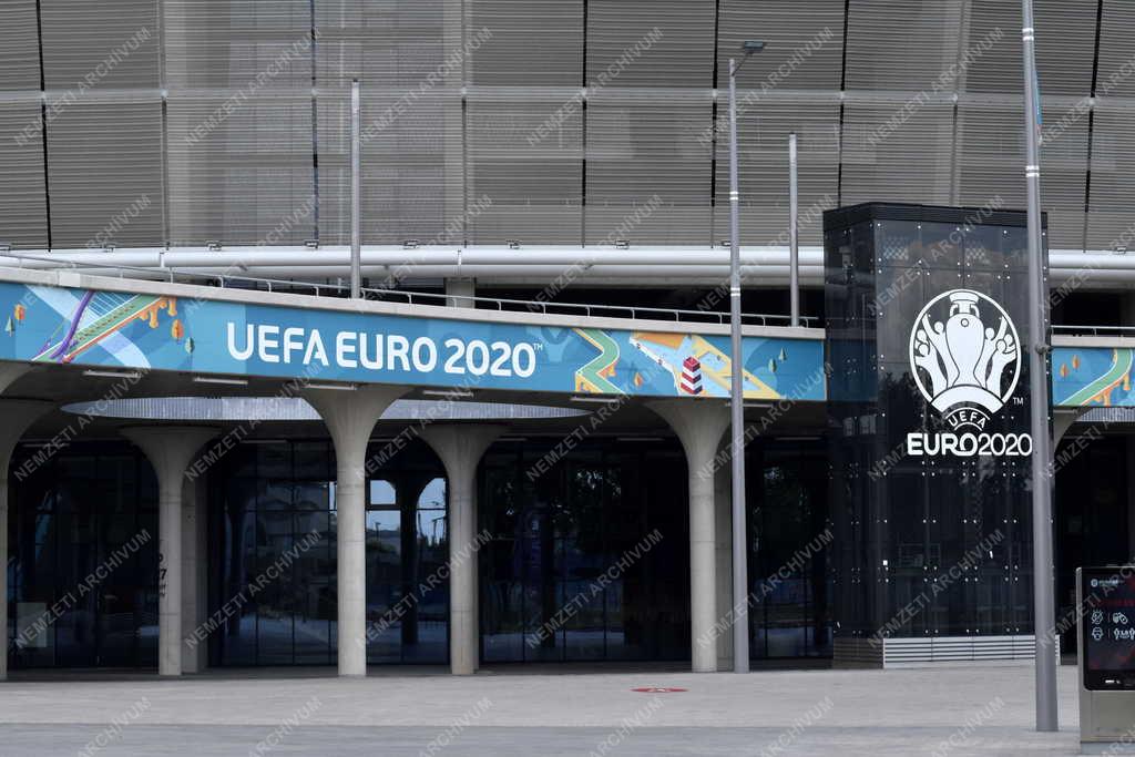Dekoráció hirdeti a Puskás Arénánál a 2020-as labdarúgó Európa-bajnokságot, az Euro 2020-at, ami a 16. Európa-bajnokság, amelyet az UEFA szervez a férfi labdarúgó-válogatottak számára. A tornát Európa-szerte 11 városban rendezik meg, amelyre eredetileg 2020. június 12. és július 12. között került volna sor, de a koronavírus-járvány miatt elhalasztották. A mérkőzéseket 2021. június 11. és július 11. között rendezik meg és hazánkban a budapesti Puskás Arénában lesznek a találkozók.