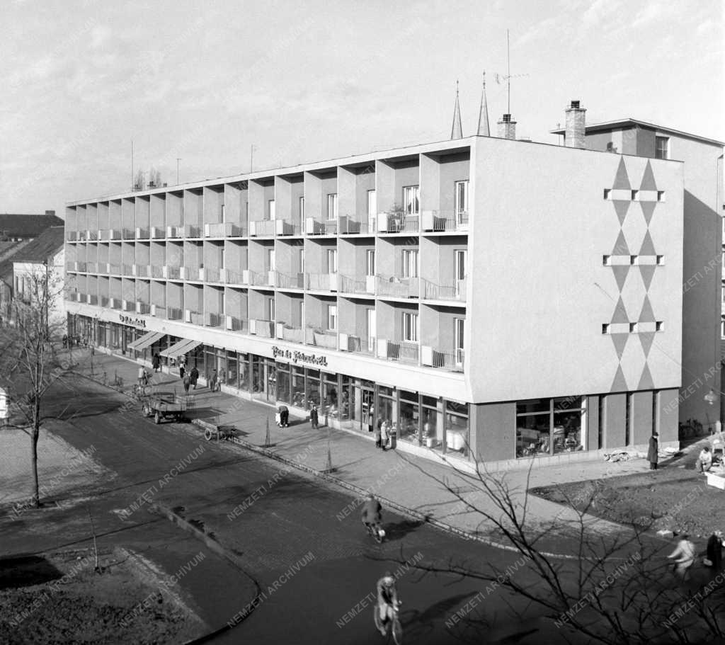 Járókelők sétálnak az új lakótelep egyik legszebb épülete előtt a Marx téren, melynek ötvennyolc lakásába 1960 tavaszán költöztek be a lakók, földszinti üzletsorát pedig az ősszel rendezték be.