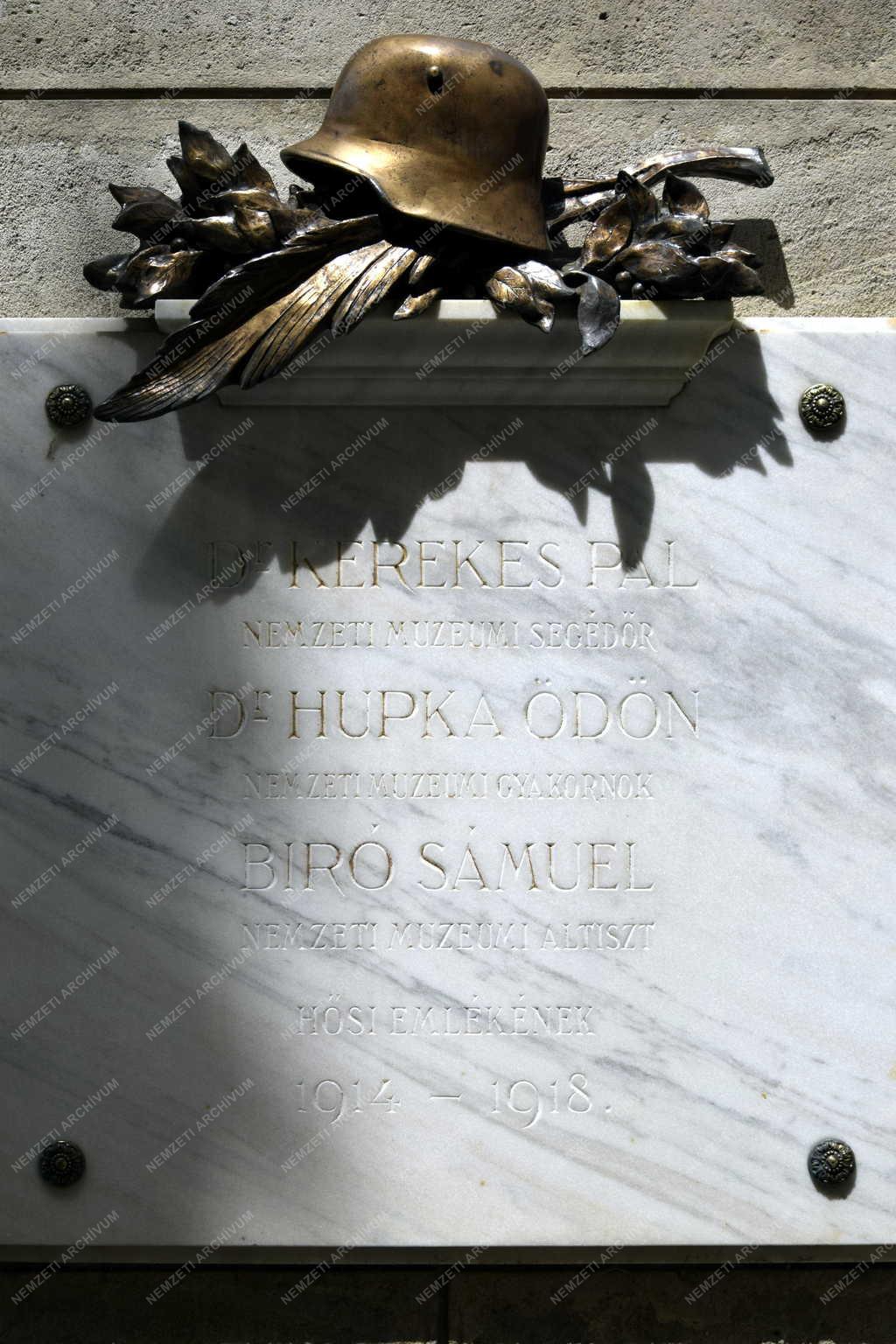 A Magyar Nemzeti Múzeum I. világháborús emléktáblája (1927) a főváros VIII. kerületében, a Magyar Nemzeti Múzeumot övező parkban, a nemzeti emlékhelyen. A mai Múzeum körút 14–16. szám alatti, 8700 négyszögöl nagyságú telket 1813-ban vásárolta meg az állam a Batthyány családtól, a Nemzeti Múzeum számára. A Múzeumkert végleges alakját 1880-ban nyerte el. A dualizmus korában, egészen a Parlament felépültéig a Múzeumkert számított az ország központi terének, mivel a felsőház a múzeum épületében, a képviselőház pedig a kert melletti egyik palotában ülésezett. A kert történeti hitelességű helyreállítása és korszerű, többfunkciós belvárosi közhasználatú zöldfelület kialakítása 2018-ban kezdődött el, miután 2016-tól nemzeti emlékhely.