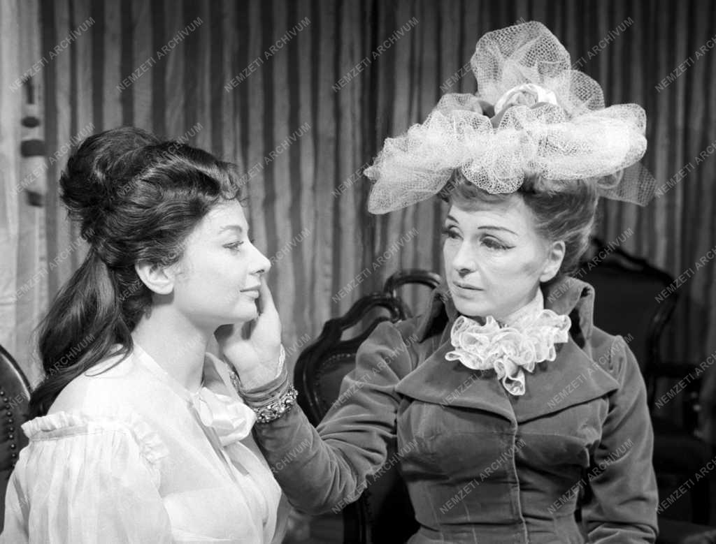 Mezei Mária Mrs. Erlynne és Váradi Hédi Lady Windermere szerepében (b-j) Oscar Wilde Lady Windermere legyezője című prózájának próbáján. A darabot 1959. december 18-án mutatja be Egri István rendezésében a Madách Színház Kamara Színháza.