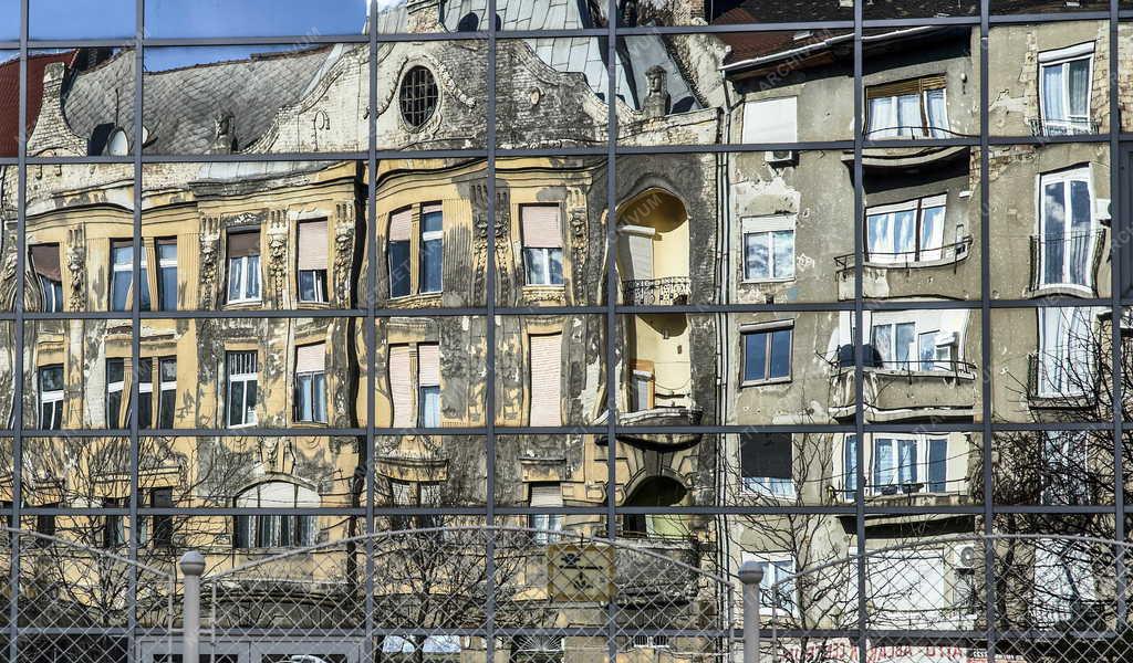 A főváros VIII. kerületében, a Fiumei úton lévő épületek tükröződnek az MVM Next Földgáz ügyfélszolgálati iroda épületének üvegfelületén.