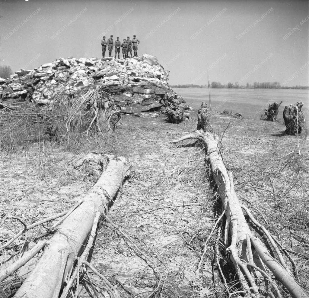 A Gerjen közelében történt gátszakadás okozta árvízveszélyt elhárító katonai különítmény tagjai a felhalmozott jégtömbökön állnak.