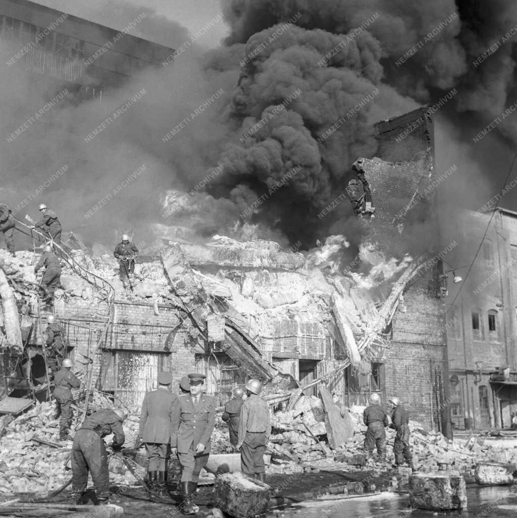 Tűzoltók dolgoznak a Ruggyantaárugyár gumilágyító üzemében keletkezett tűz oltásán. A tűz megfékezése során a Ruggyantaárugyár két dolgozója és három tűzoltó sérüléseket szenvedett, akiket a mentők kórházba szállítottak.
