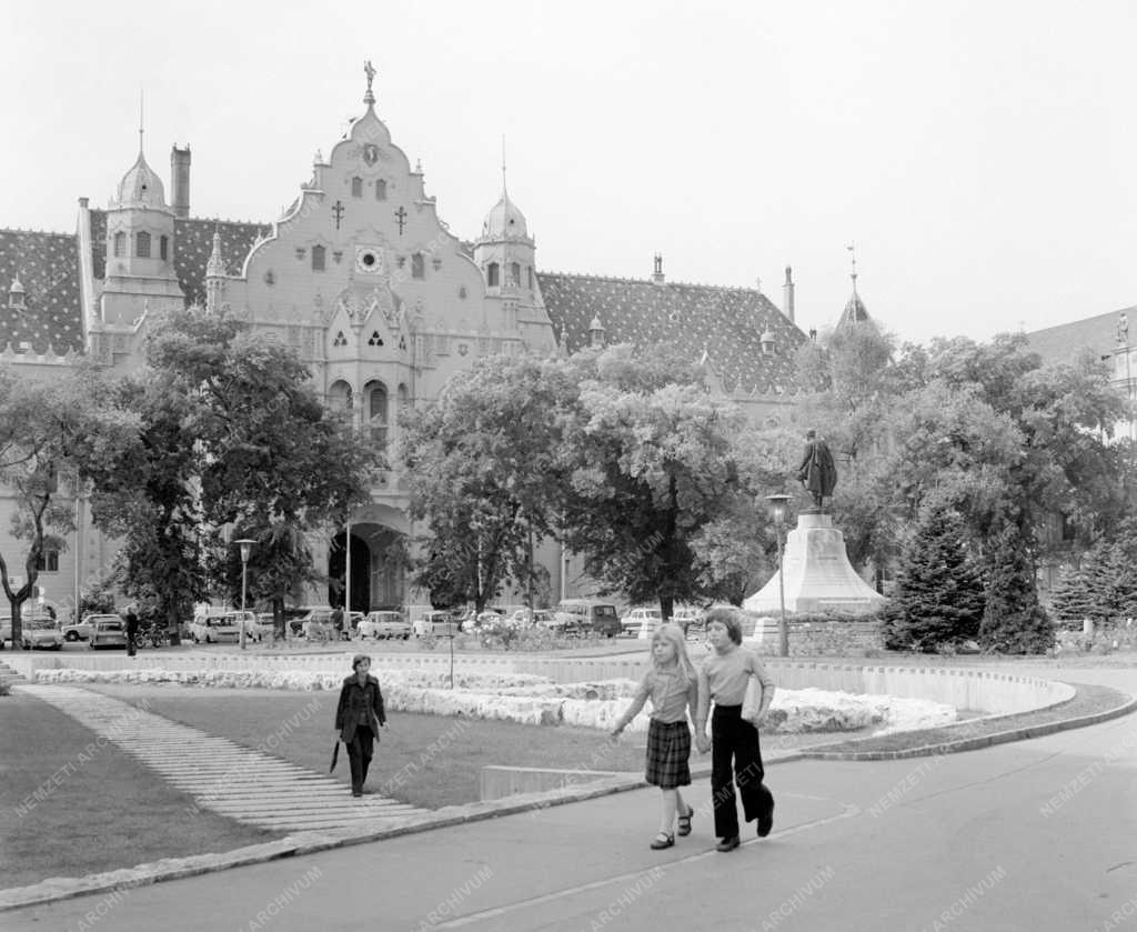 Látkép a kecskeméti Városházáról a város főterén, a Kossuth tér 1. szám alatt. 1893 és 1897 között épült Lechner Ödön és Pártos Gyula tervei szerint, szecessziós stílusban. Előtte Kossuth Lajos szobra (Telcs Ede, 1906).